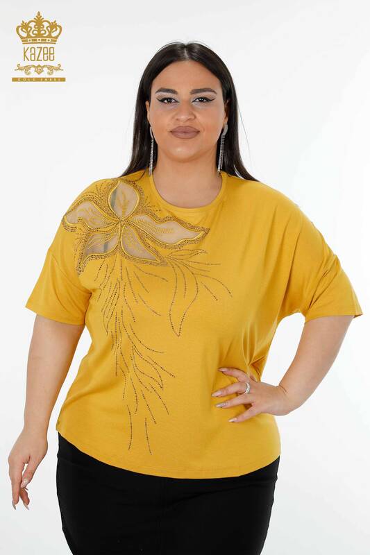 Großhandel Damenbluse Blumenmuster Stein bestickt Tüll detailliert Safran - 78908 | KAZEE