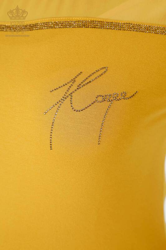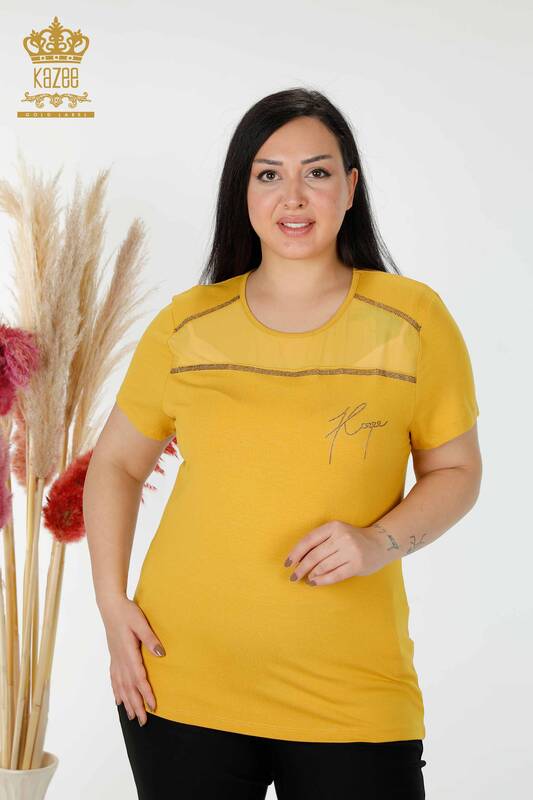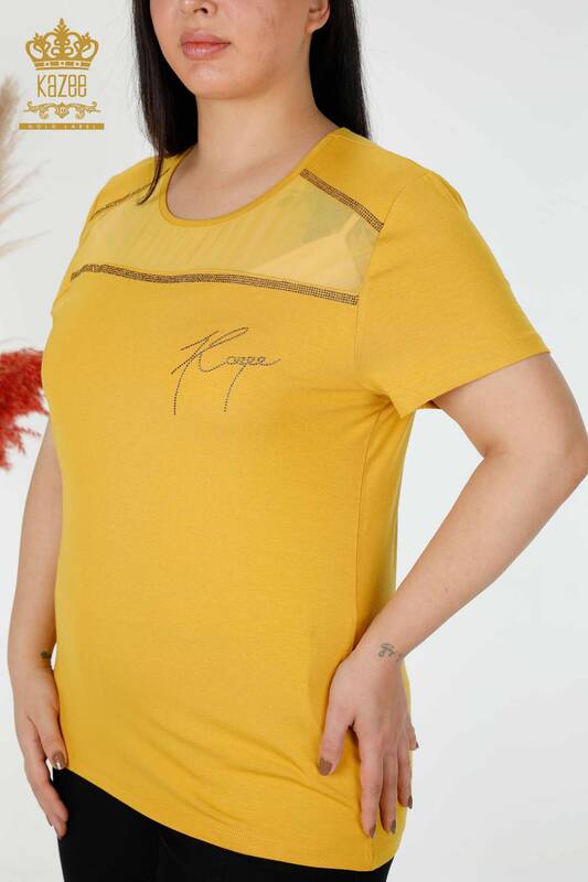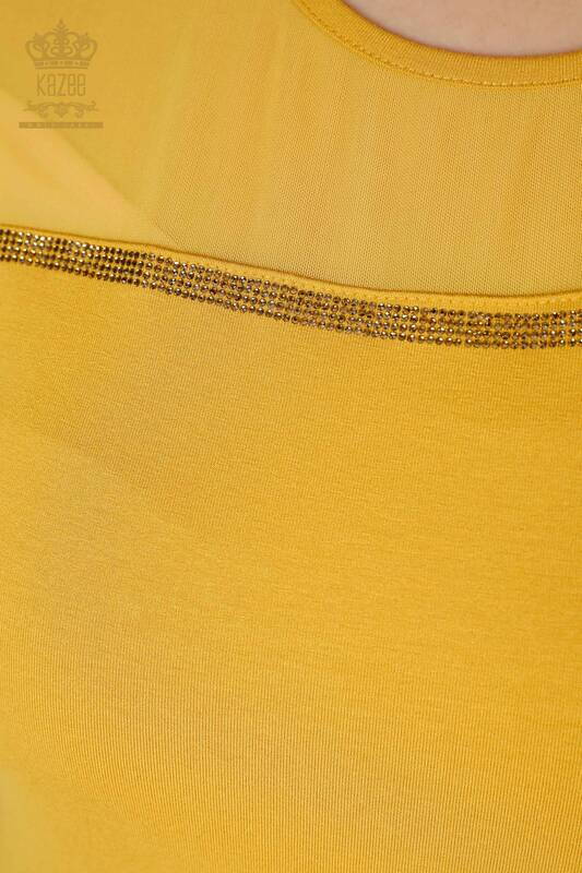 Toptan Kadın Bluz Amerikan Model Tül Detaylı Taş İşlemeli Safran - 78996 | KAZEE