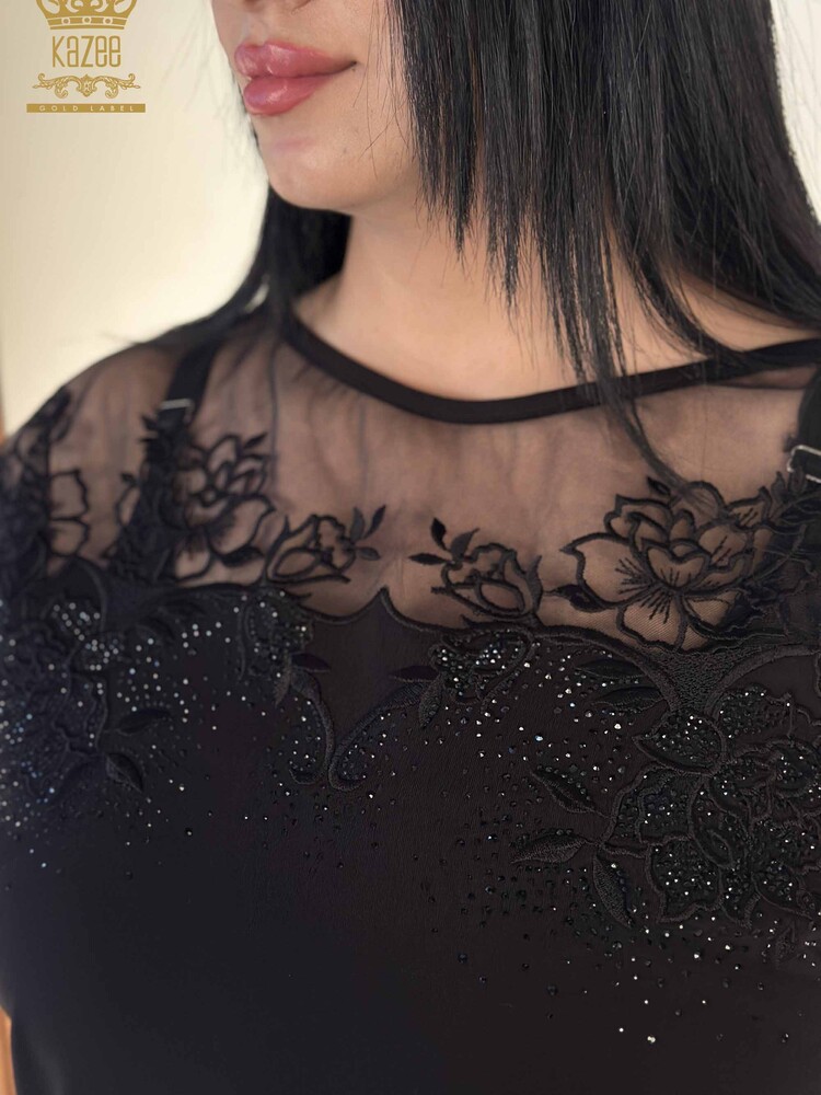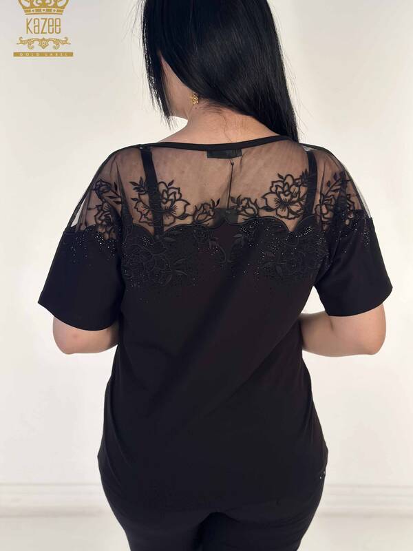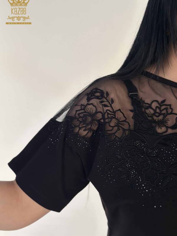 Toptan Kadın Bluz Tül Detaylı Çiçek Nakışlı Taş İşlemeli Siyah - 79453 | KAZEE