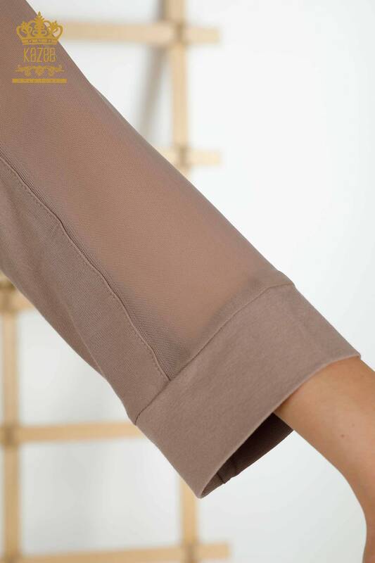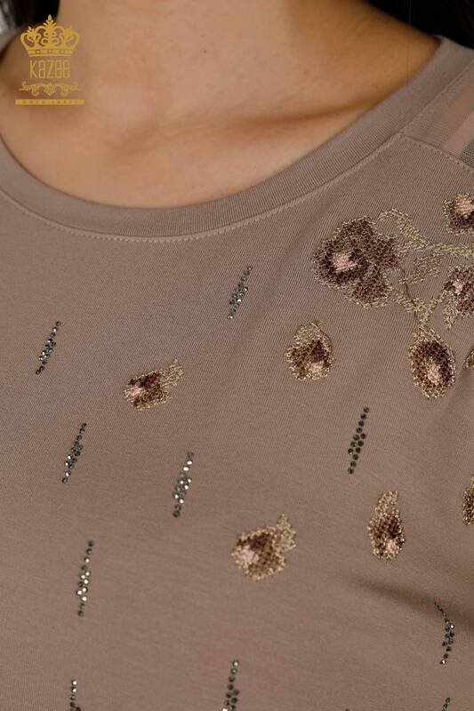 Toptan Kadın Bluz Taş İşlemeli Çiçek Desenli Vizon - 79136 | KAZEE