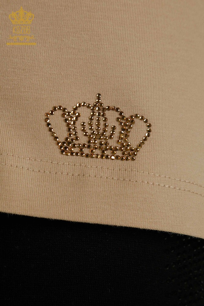 Vendita all'ingrosso Camicetta da donna scollo a V pietra logo ricamato beige - 79564 | KAZEE