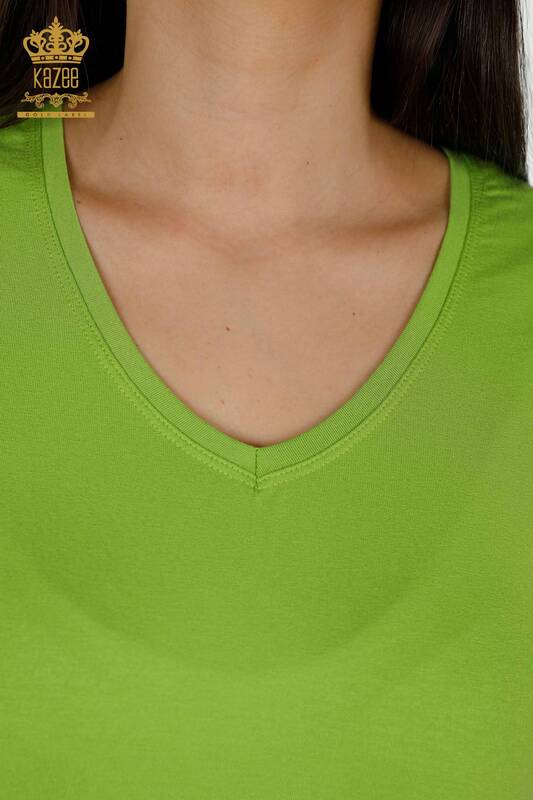 Toptan Kadın Bluz V Yaka Kısa Kol Basic Fıstık Yeşil - 79179 | KAZEE