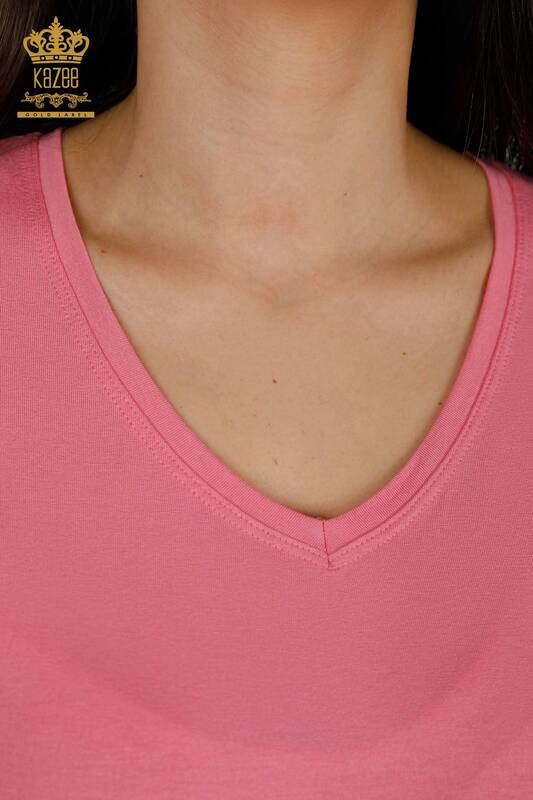 Großhandel Damenbluse V-Ausschnitt Kurzarm Basic Pink - 79179 | KAZEE