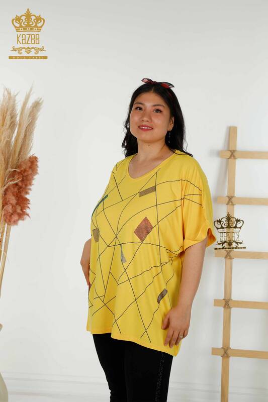 Camicetta da donna all'ingrosso con scollo a V pietra ricamata manica corta gialla - 79320 | KAZEE