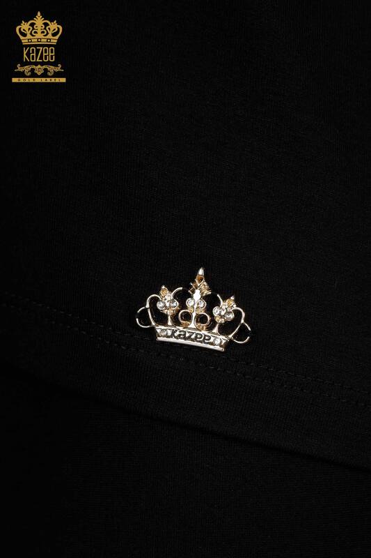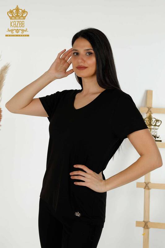 Toptan Kadın Bluz V Yaka Kısa Kol Basic Siyah - 79179 | KAZEE