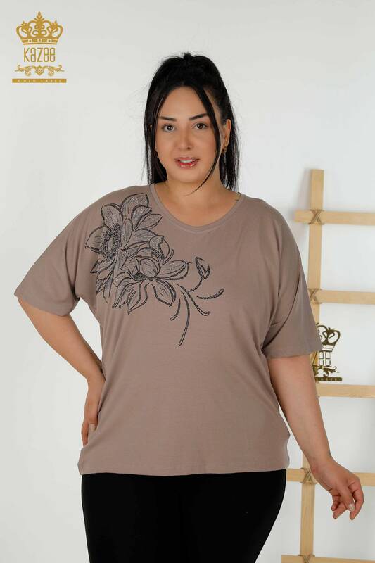 Toptan Kadın Bluz V Yaka Taş İşlemeli Kısa Kol Vizon - 79341 | KAZEE