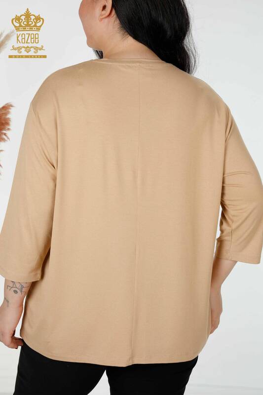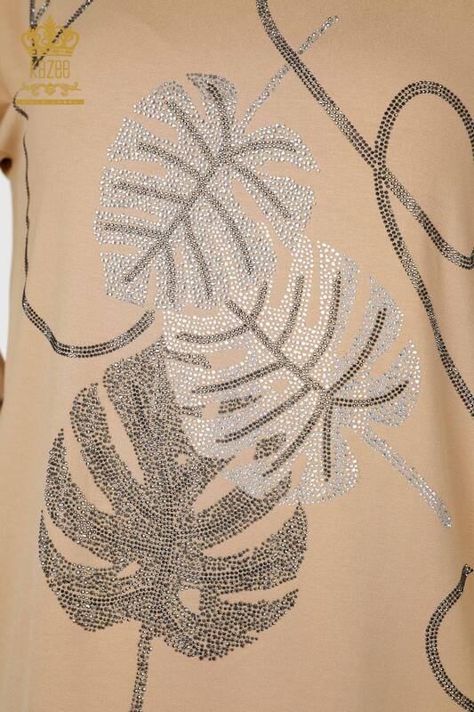 оптом Женская блузка с узором в виде листьев, вышитая камнем, бежевая - 78946 | КАЗЕЕ