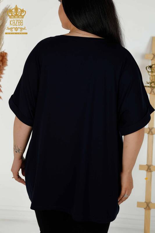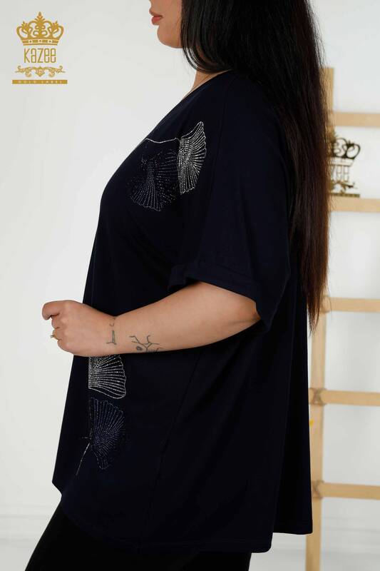 Toptan Kadın Bluz Yaprak Desenli Taş İşlemeli Lacivert - 79318 | KAZEE