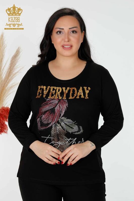 Toptan Kadın Bluz Desenli Yaprak Desenli Taş İşlemeli Siyah - 77913 | KAZEE