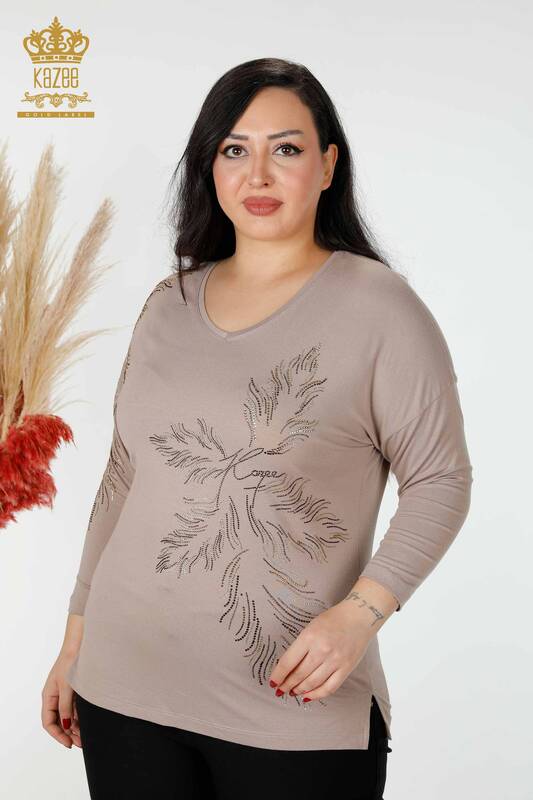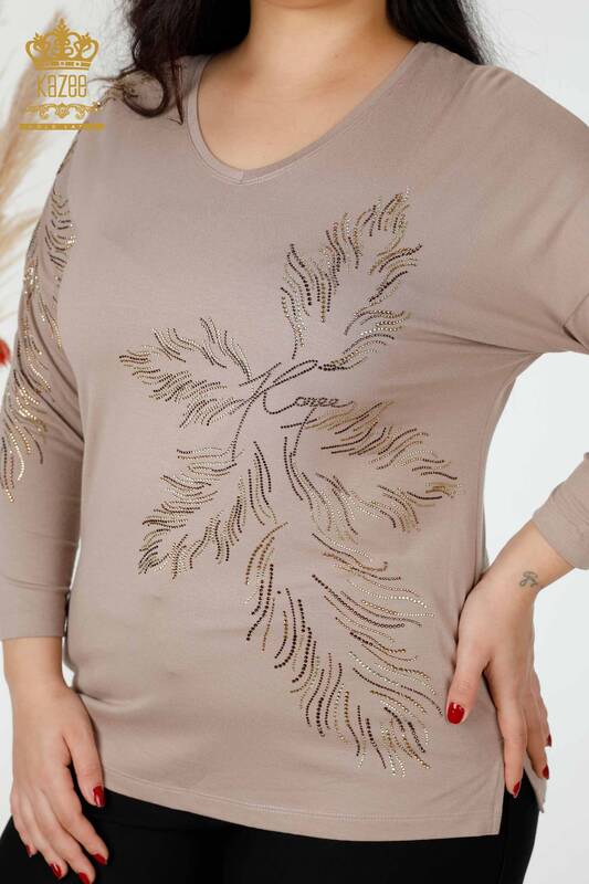 Toptan Kadın Bluz Yaprak Desenli Taş İşlemeli Vizon - 77970 | KAZEE