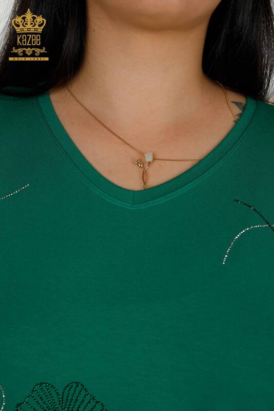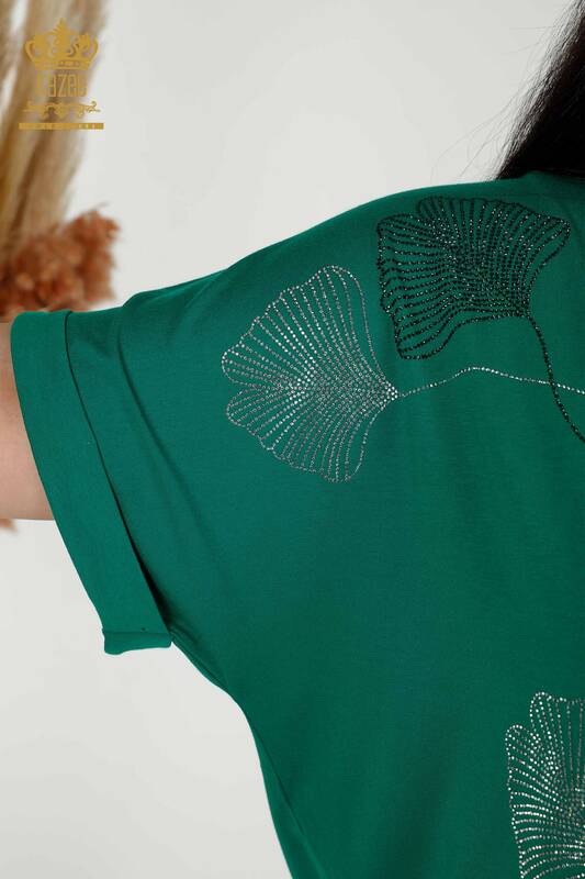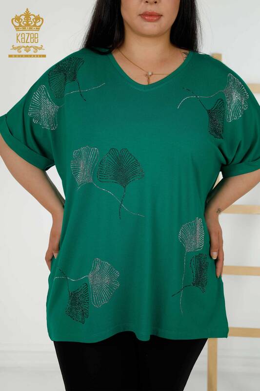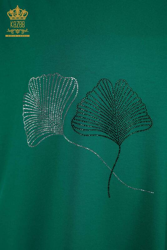 Toptan Kadın Bluz Yaprak Desenli Taş İşlemeli Yeşil - 79318 | KAZEE