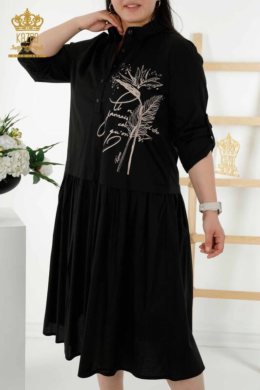Venta al por mayor Vestido de Mujer Estampado Botón Detalle Piedra Bordada Negro - 20324 | kazee