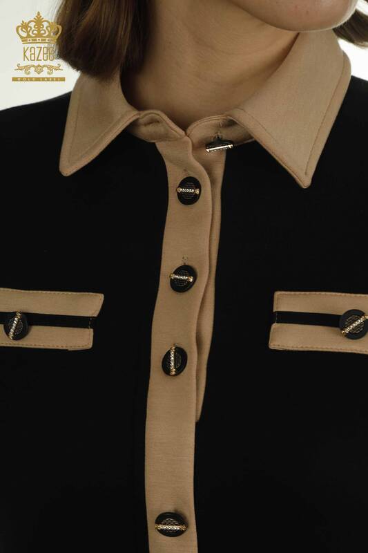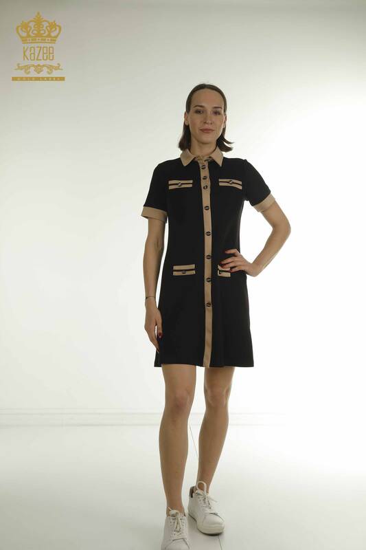 Toptan Kadın Elbise Düğme Detaylı Siyah Camel - 17701 | KAZEE