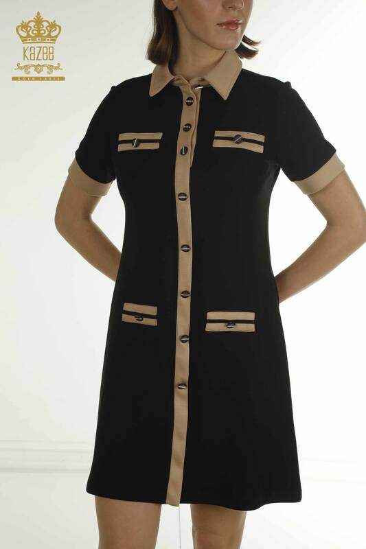 Toptan Kadın Elbise Düğme Detaylı Kısa Kol Siyah Camel - 17701 | KAZEE