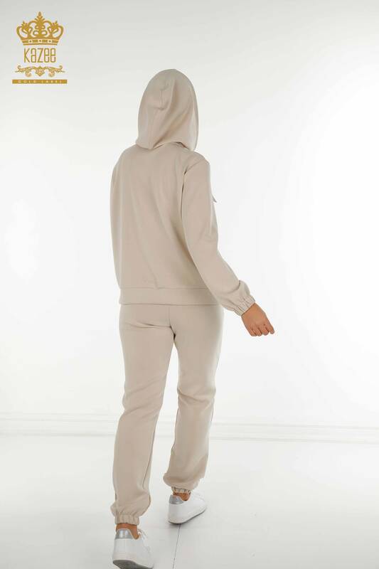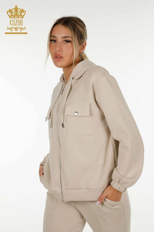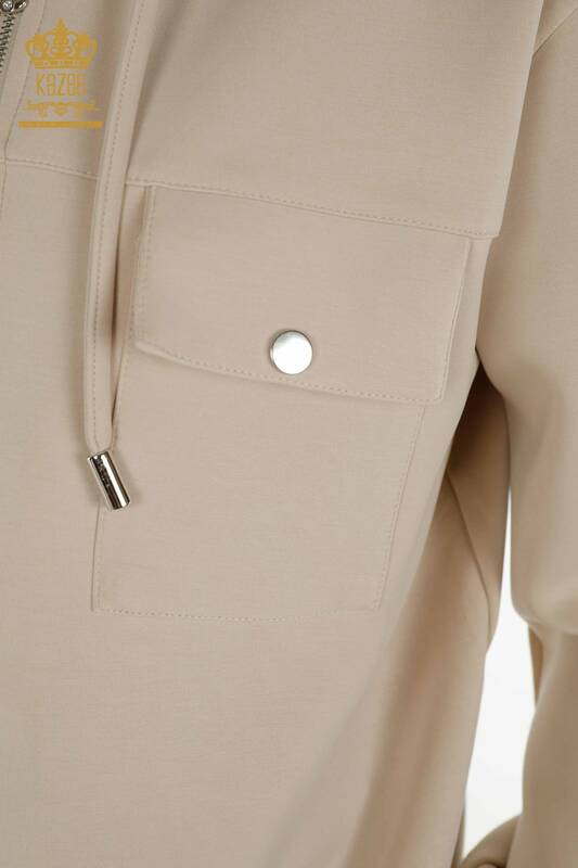 Toptan Kadın Eşofman Takımı Fermuarlı Düğmeli Kapüşonlu Taş - 17620 | KAZEE