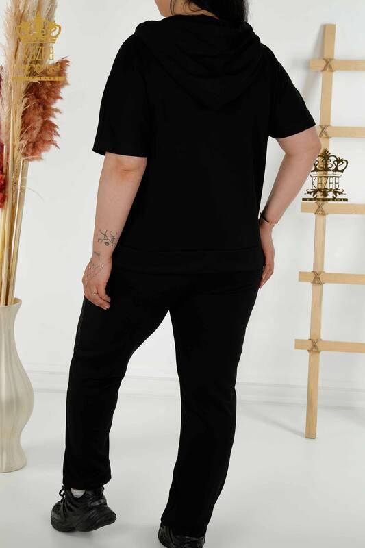 بدلة رياضية نسائية بالجملة بسحاب بأكمام قصيرة مطرزة بالأحجار السوداء - 20389 | كازي