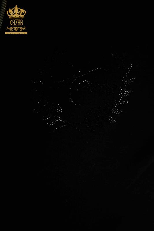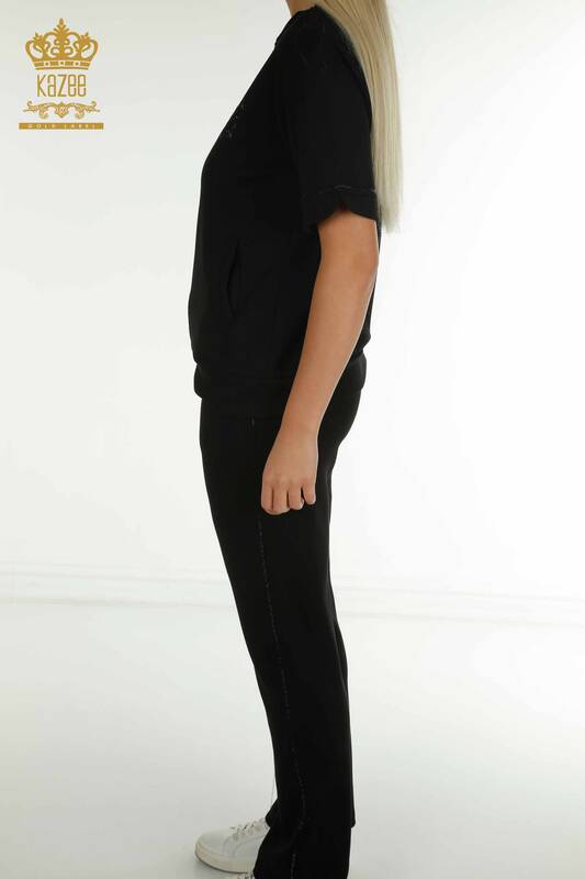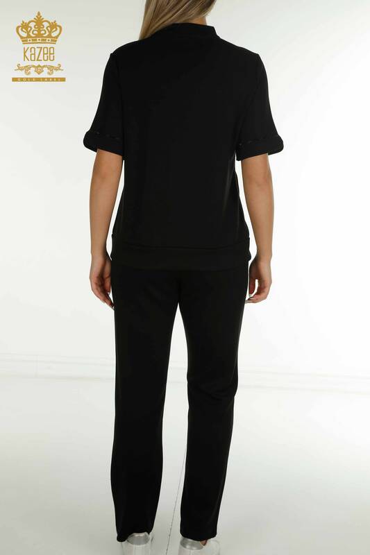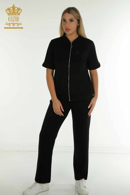 Toptan Kadın Eşofman Takımı Kısa Kol Taş İşlemeli Fermuarlı Cepli Siyah - 17636 | KAZEE