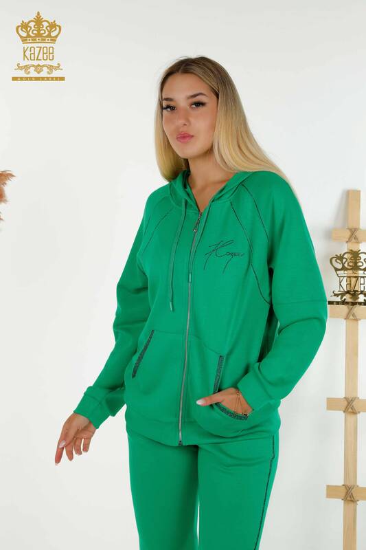 Toptan Kadın Eşofman Takımı Taş İşlemeli Fermuarlı Kapüşonlu Yeşil - 20415 | KAZEE