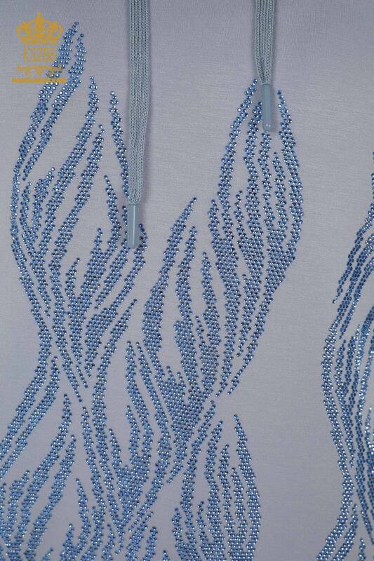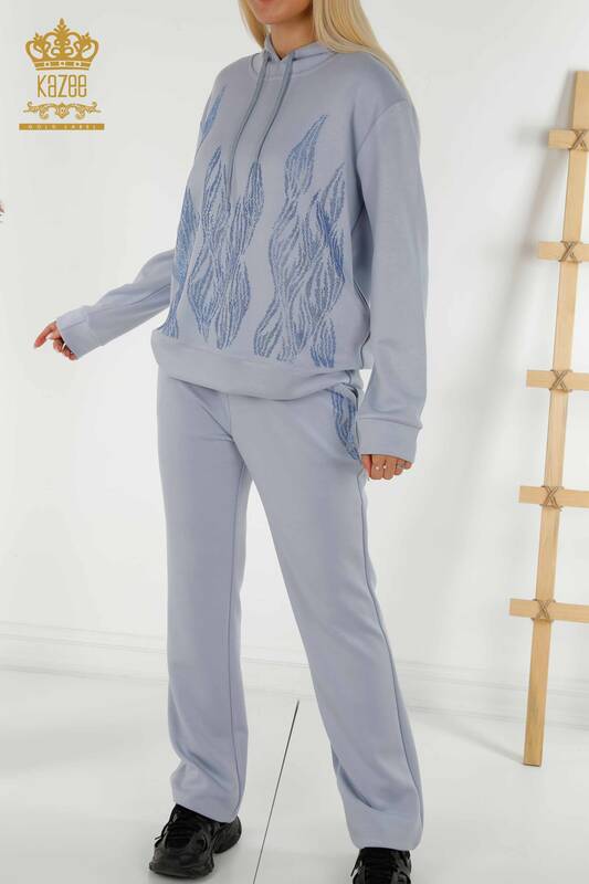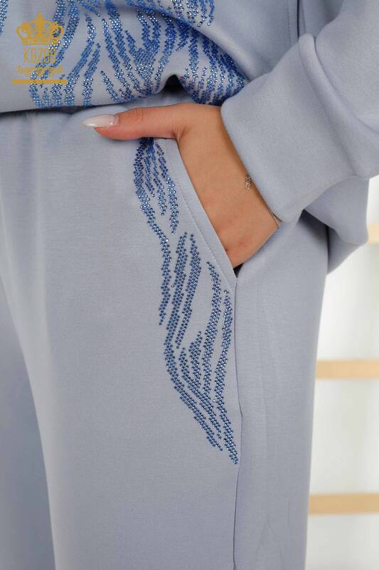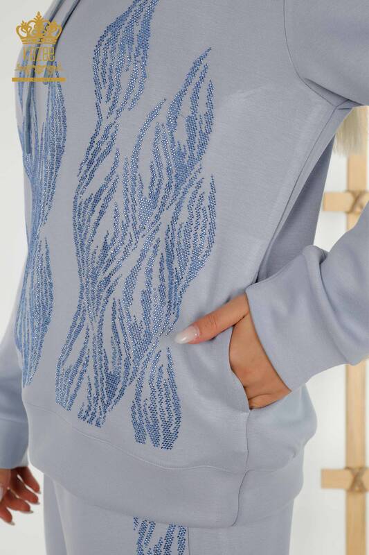 Toptan Kadın Eşofman Takımı Taş İşlemeli Kapüşonlu Cepli Mavi - 17566 | KAZEE