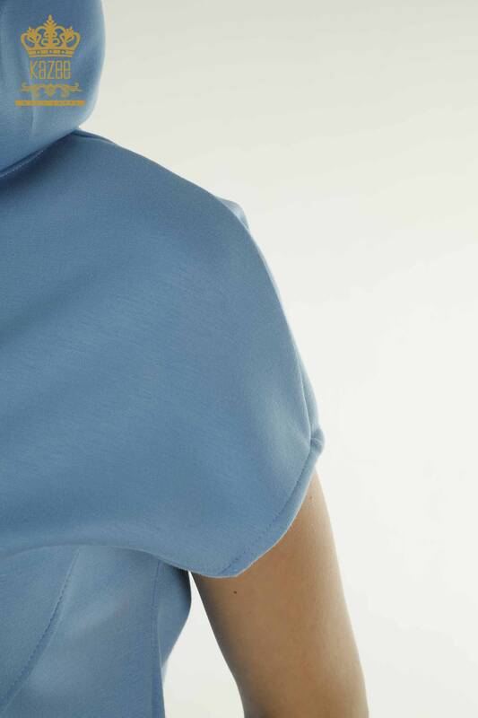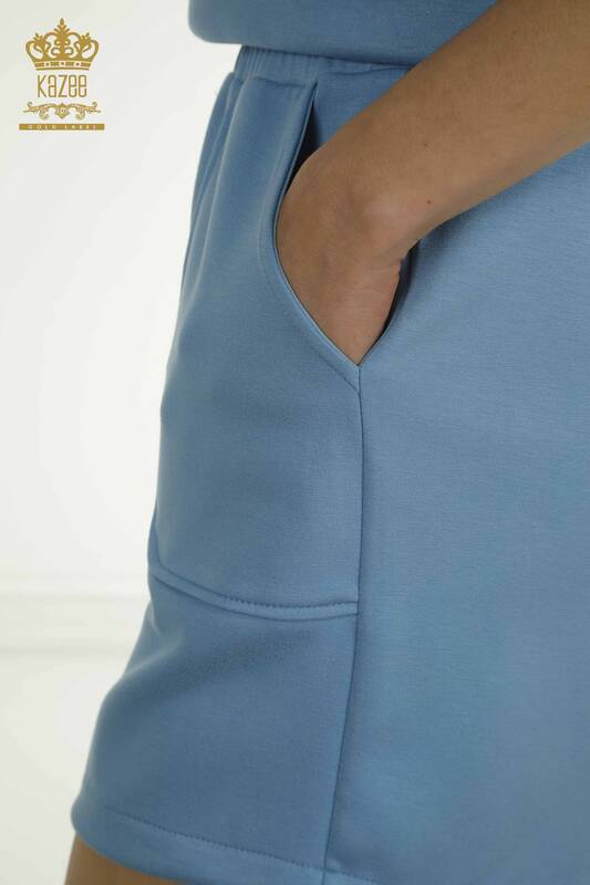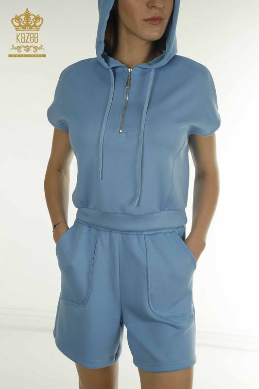 Toptan Kadın Eşofman Takımı Kısa Kol Kapüşonlu Mavi - 17704 | KAZEE
