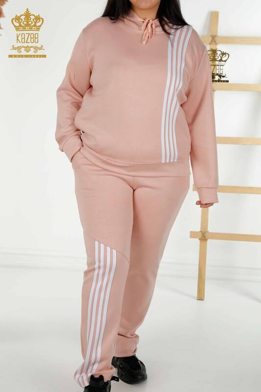 Toptan Kadın Eşofman Takımı Kapüşonlu Çizgili İki Renk Pudra Beyaz - 17569 | KAZEE