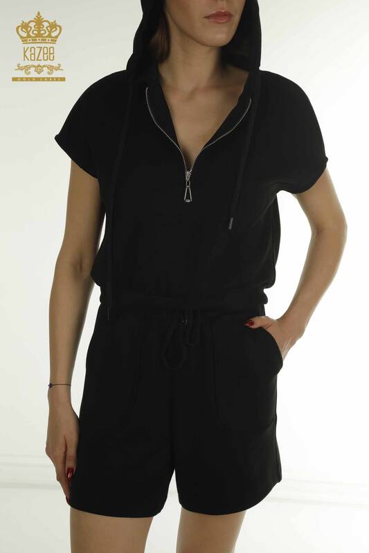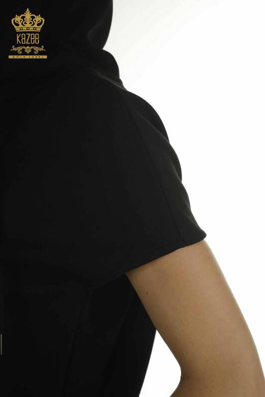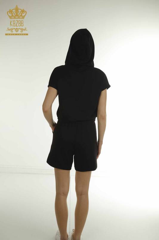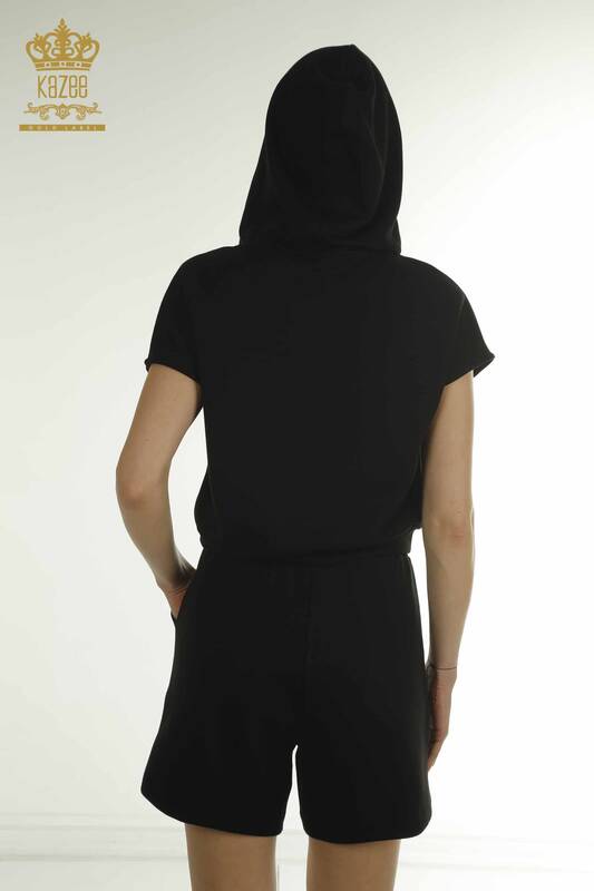 Toptan Kadın Eşofman Takımı Kısa Kol Kapüşonlu Siyah - 17704 | KAZEE