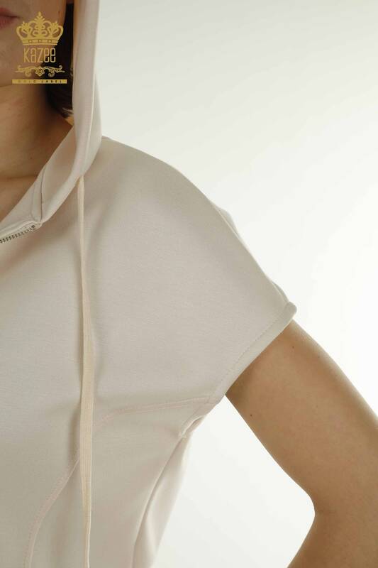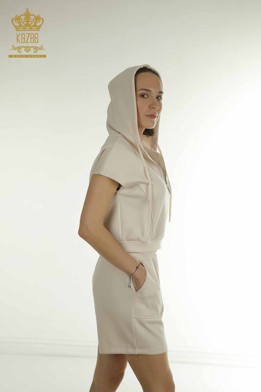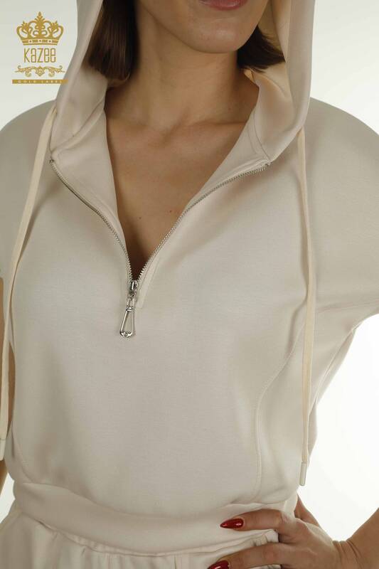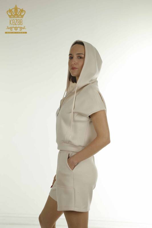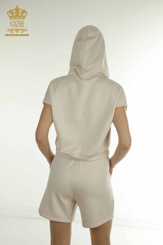 Toptan Kadın Eşofman Takımı Kısa Kol Kapüşonlu Taş - 17704 | KAZEE