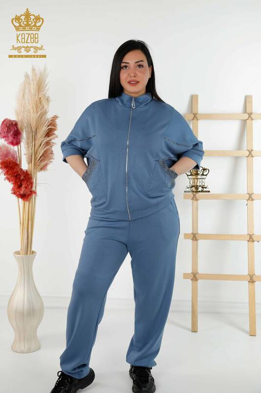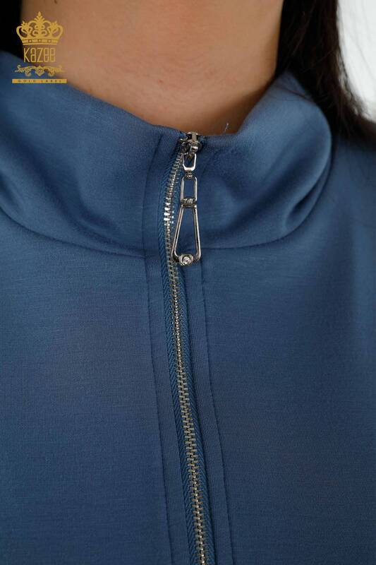 Toptan Kadın Eşofman Takımı Kısa Kol Fermuarlı Taş İşlemeli İndigo - 17547 | KAZEE