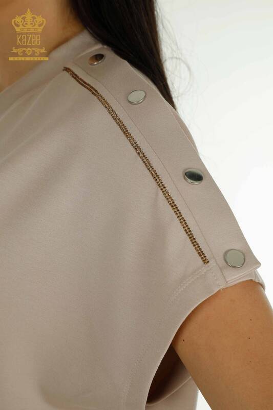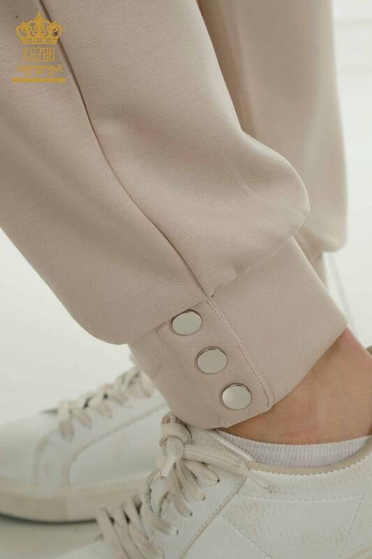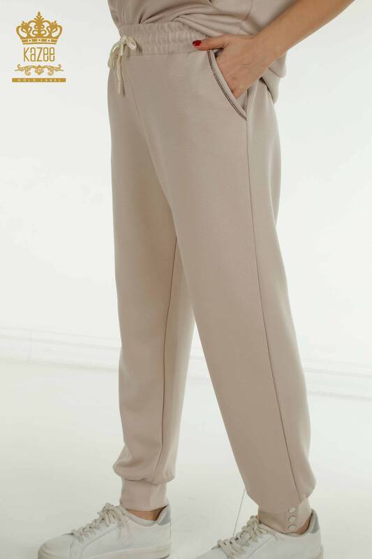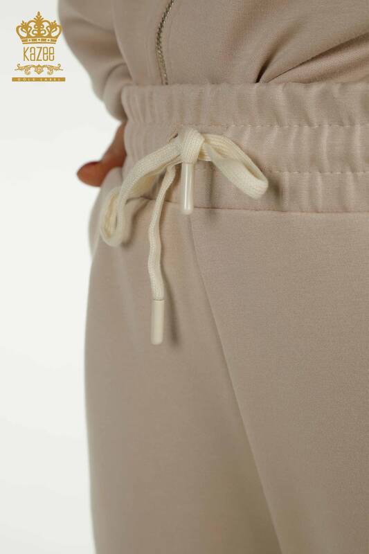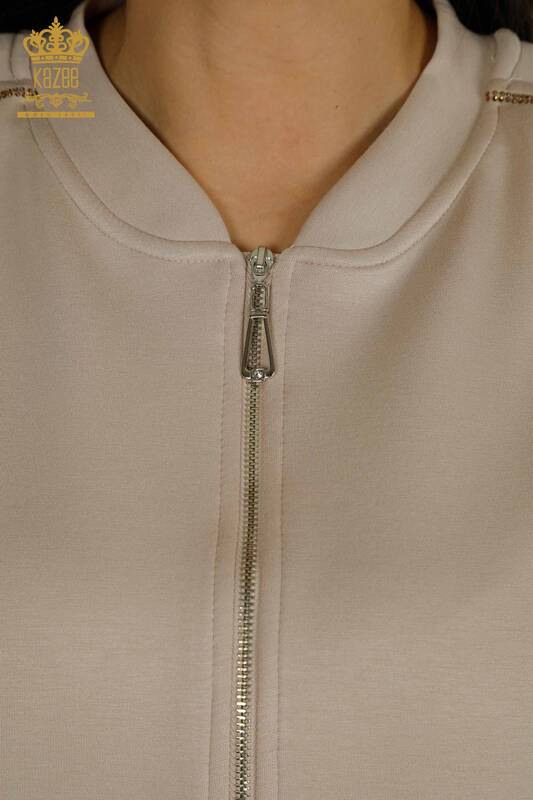 Toptan Kadın Eşofman Takımı Kısa Kollu Taş İşlemeli Fermuarlı Vizon - 17680 | KAZEE