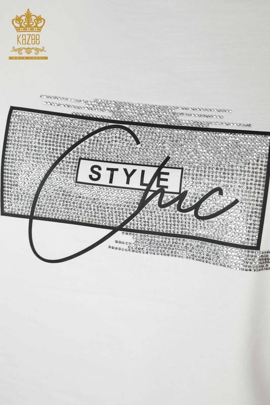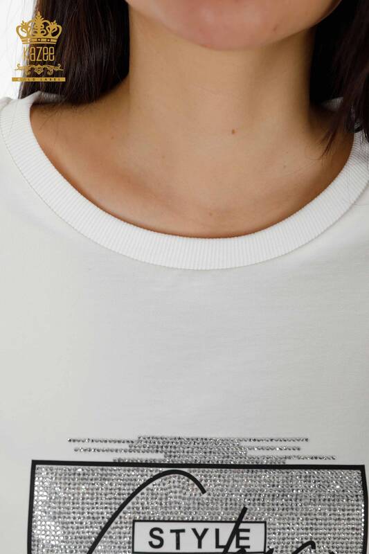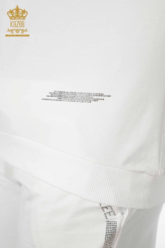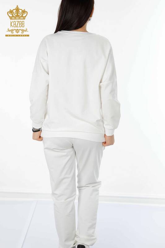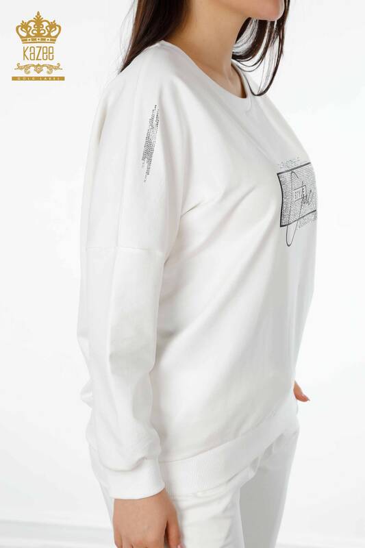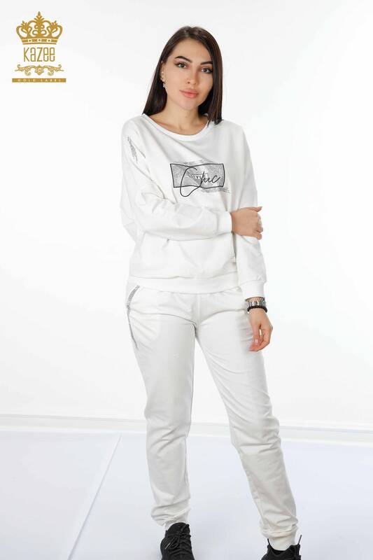 Toptan Kadın Eşofman Takımı Kristal Taş İşlemeli Ekru - 17461 | KAZEE