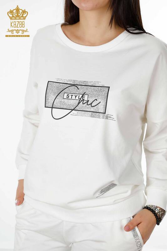 Toptan Kadın Eşofman Takımı Kristal Taş İşlemeli Yazı Detaylı Cepli Ekru - 17461 | KAZEE