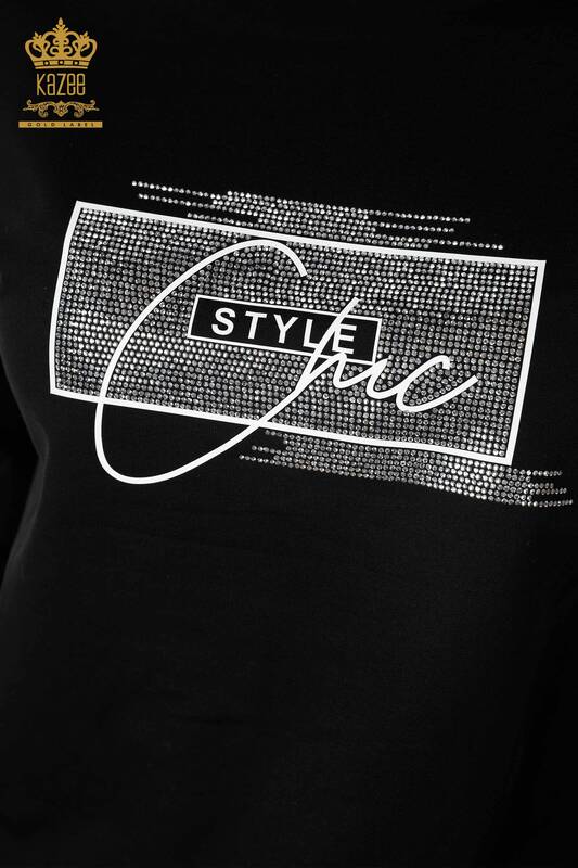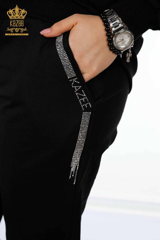 Toptan Kadın Eşofman Takımı Kristal Taş İşlemeli Yazı Detaylı Cepli Siyah - 17461 | KAZEE