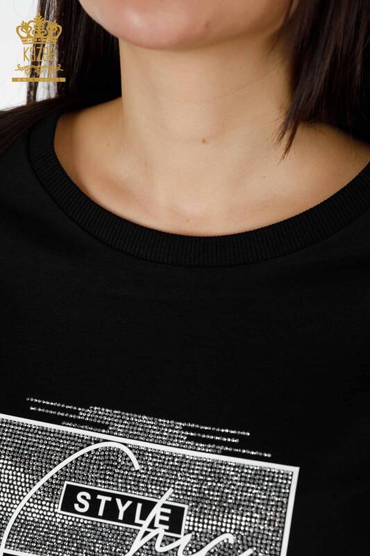 Toptan Kadın Eşofman Takımı Kristal Taş İşlemeli Siyah - 17461 | KAZEE