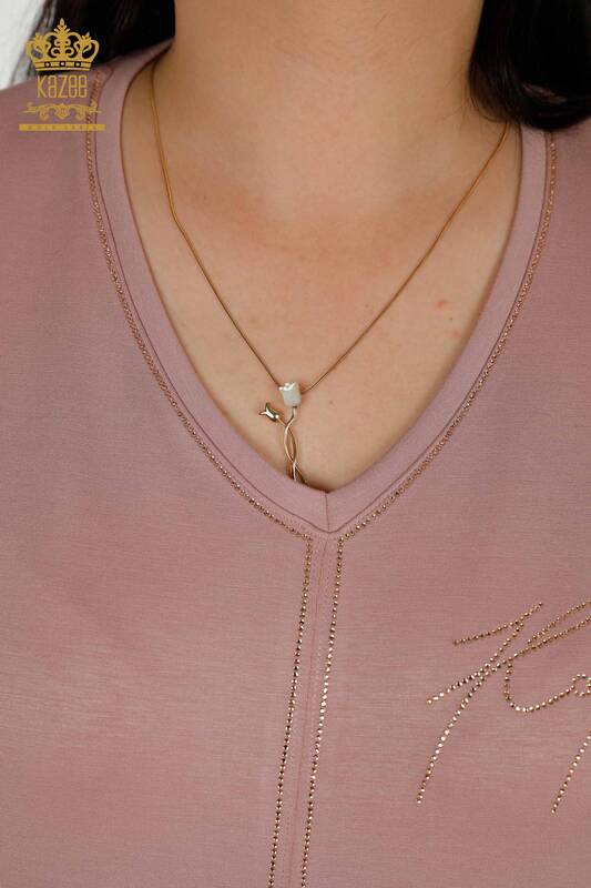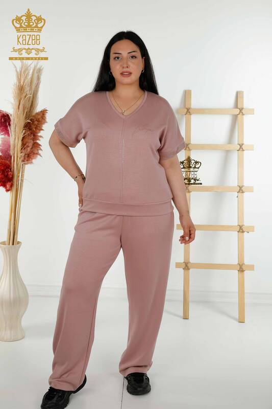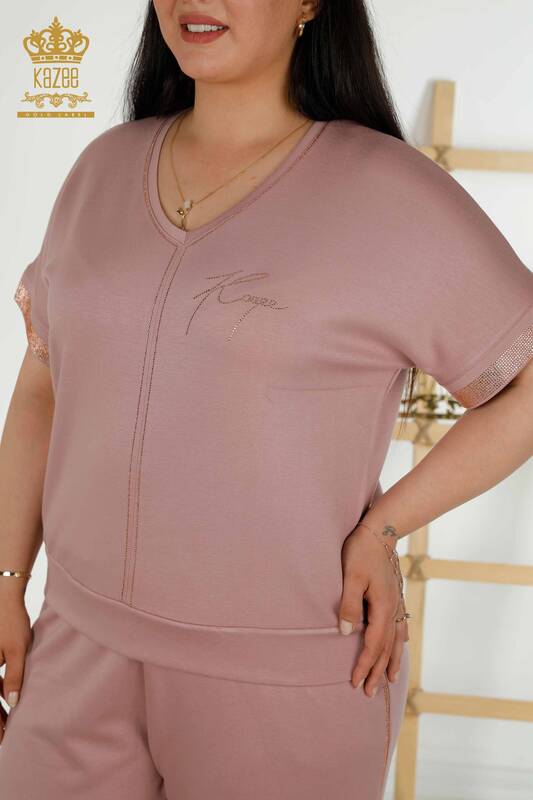 Toptan Kadın Eşofman Takımı Taş İşlemeli Cepli Kısa Kol Gül - 20391 | KAZEE