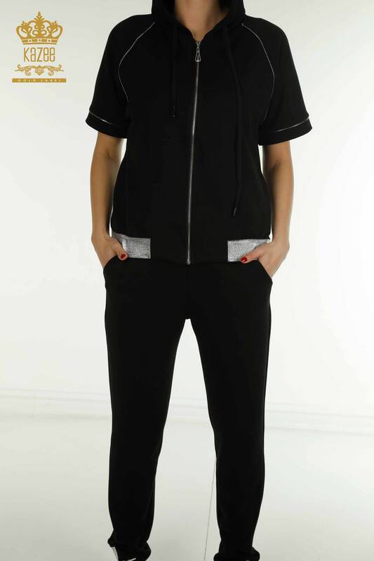 Großhandel Damen-Trainingsanzug-Set mit Reißverschluss und Kapuze, Steinstickerei, Schwarz – 17638 | KAZEE