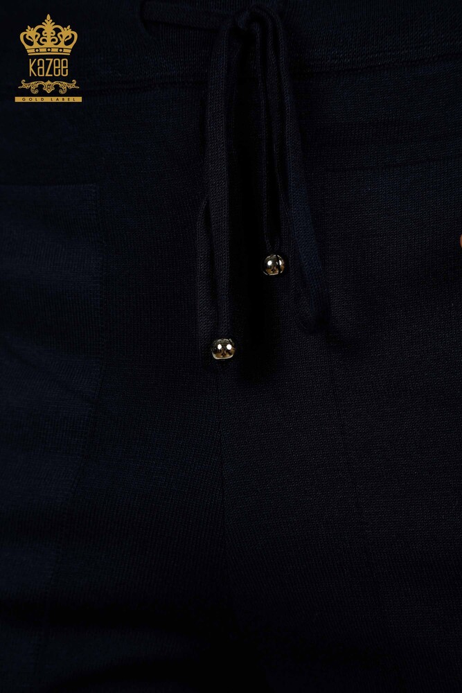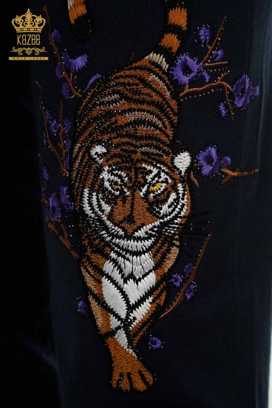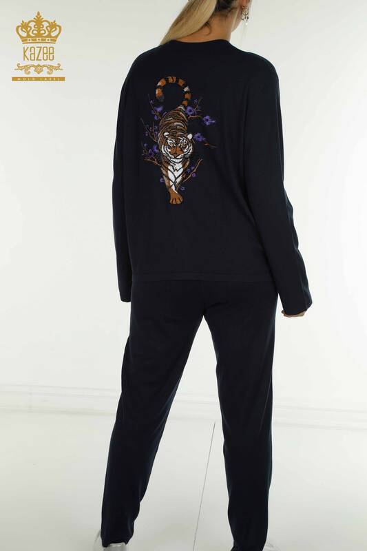 Hurtowy komplet damski dresowy, haftowany w kamienie, zapinany na zamek, granatowy we wzór panterki - 16662 | KAZEE