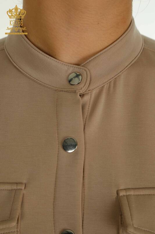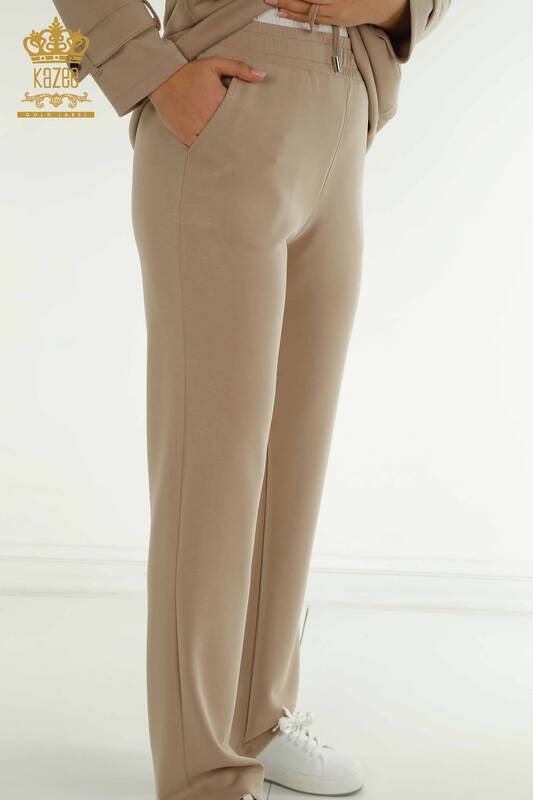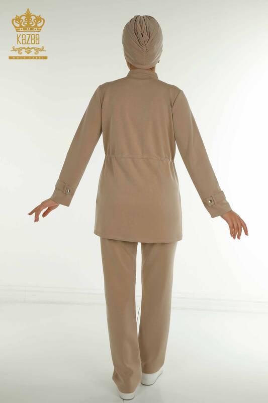 Toptan Kadın Eşofman Tesettür Takımı Düğme Detaylı Cepli Bej - T-02 | KAZEE
