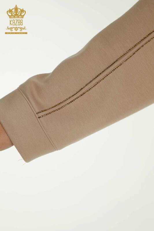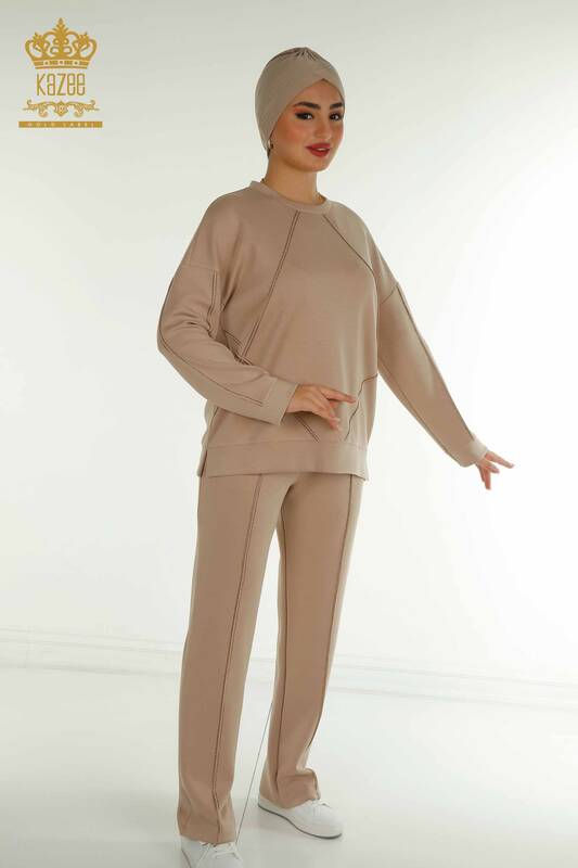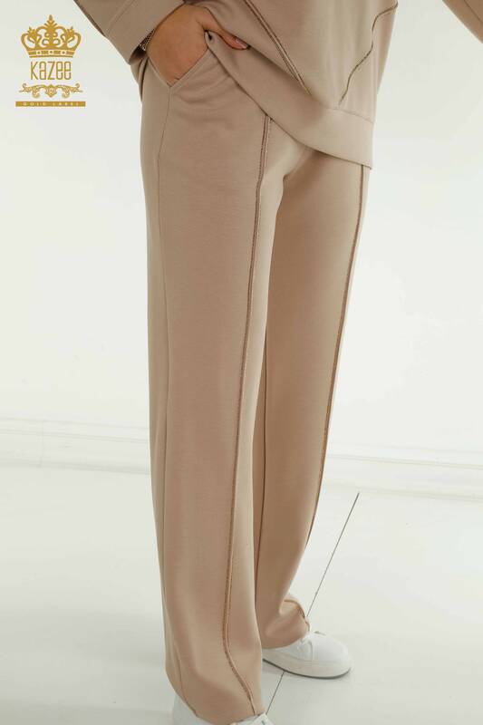 Toptan Kadın Eşofman Tesettür Takımı Taş İşlemeli Cepli Bej - T-01 | KAZEE
