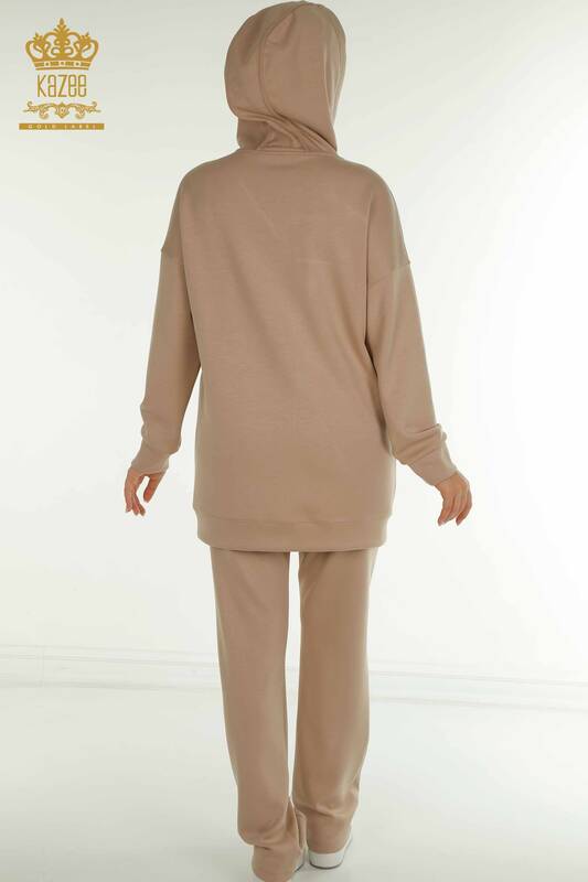 Toptan Kadın Eşofman Tesettür Takımı Yarım Düğme Detaylı  - Bej T-03 | KAZEE