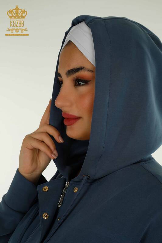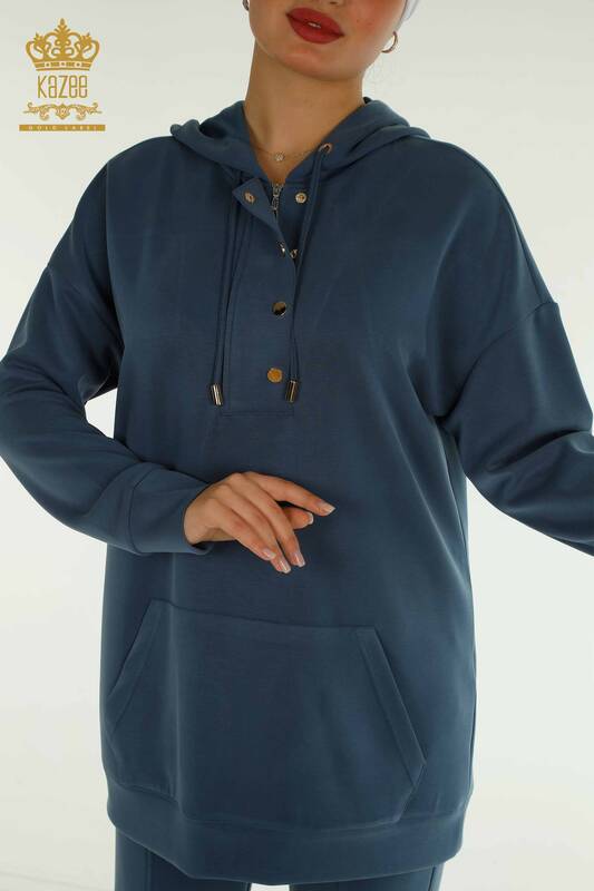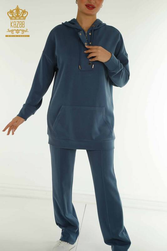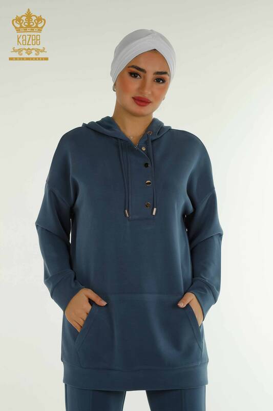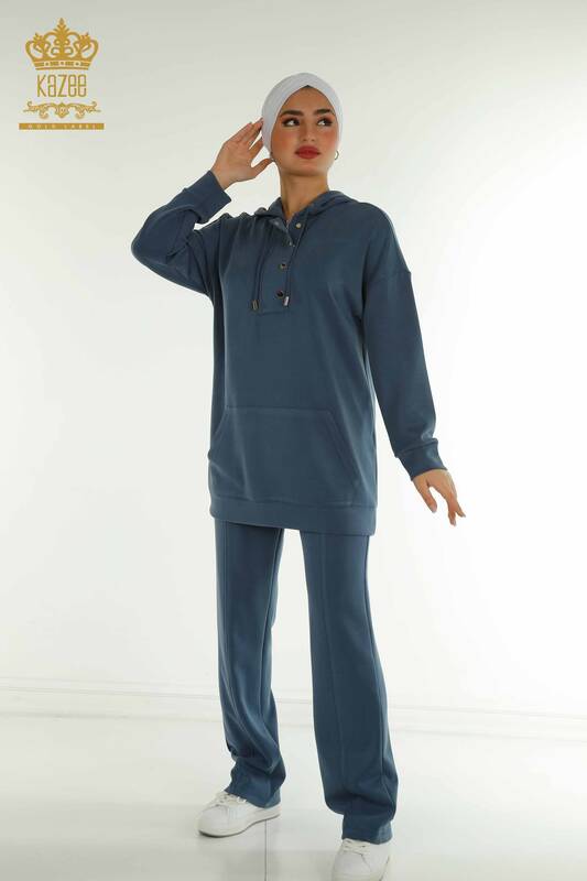 Toptan Kadın Eşofman Tesettür Takımı Yarım Düğme Detaylı - Petrol T-03 | KAZEE