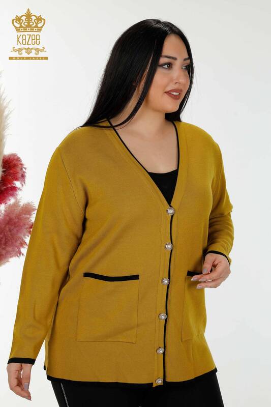 خردل جیبی دکمه دار ژاکت کش باف پشمی زنانه - 30148 | KAZEE