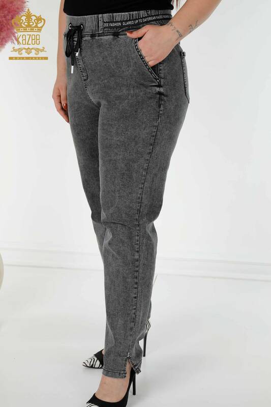 Hurtownia Damskich Spodnie Jeansowe z Kieszeniami, Haftowane Kamieniami, Elastyczny Pas Antracytowe - 3697 | KAZEE