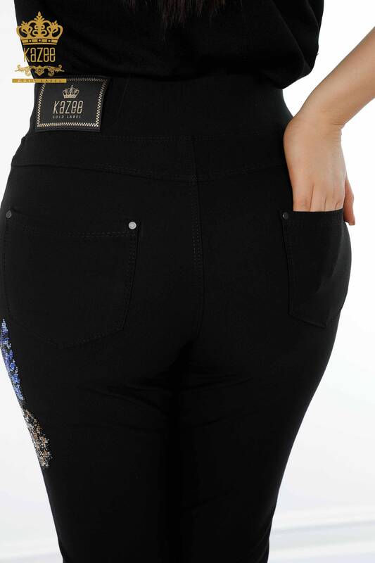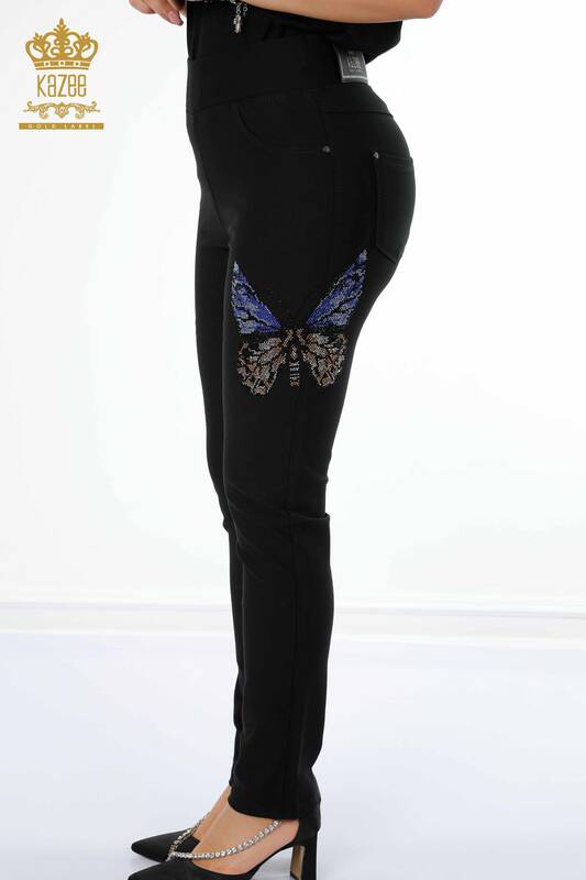 Cu ridicata Jambiere de damă Pantaloni cu model de fluturi Buzunare brodate cu piatră colorată Negru - 3582 | KAZEE