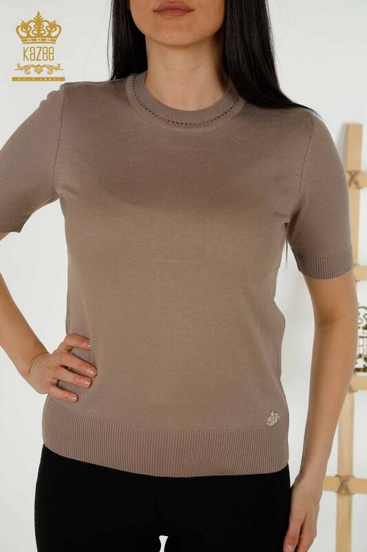 Toptan Kadın Triko Kazak Amerikan Model Basic Logolu Vizon - 30255 | KAZEE