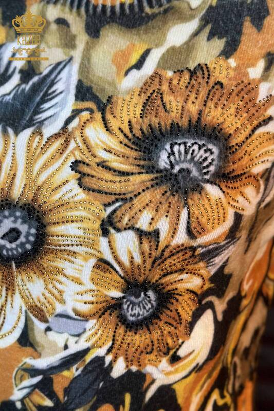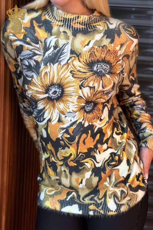 Toptan Kadın Triko Kazak Angora Dik Yaka Taş İşlemeli Safran - 18950 | KAZEE