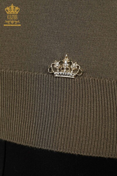سترة تريكو نسائية بالجملة بشعار أساسي بياقة دائرية كاكي - 30213 | كازي