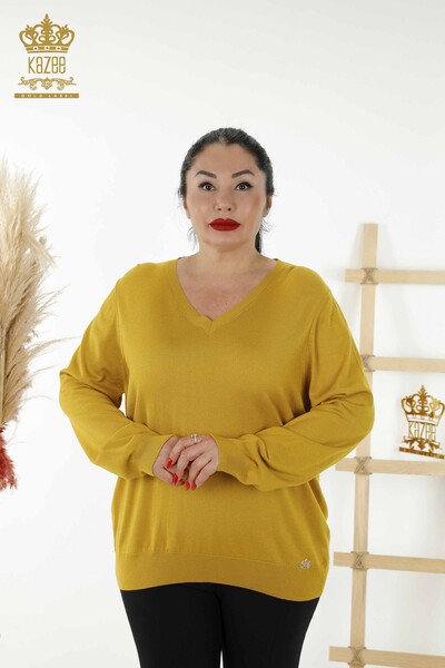 سترة تريكو نسائية بالجملة بياقة على شكل V وشعار أساسي أزرق - 30181 | كازي