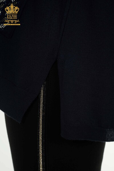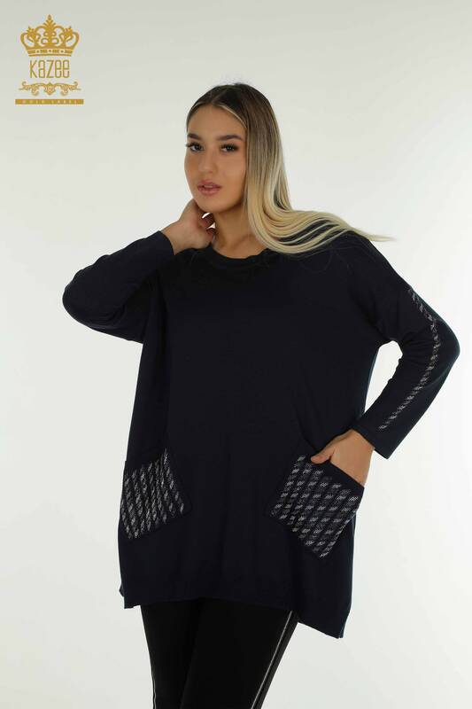 Venta al por mayor de punto para mujer Suéter Bolsillo Detallado Piedra Bordada Azul Marino - 30591 | KAZEE