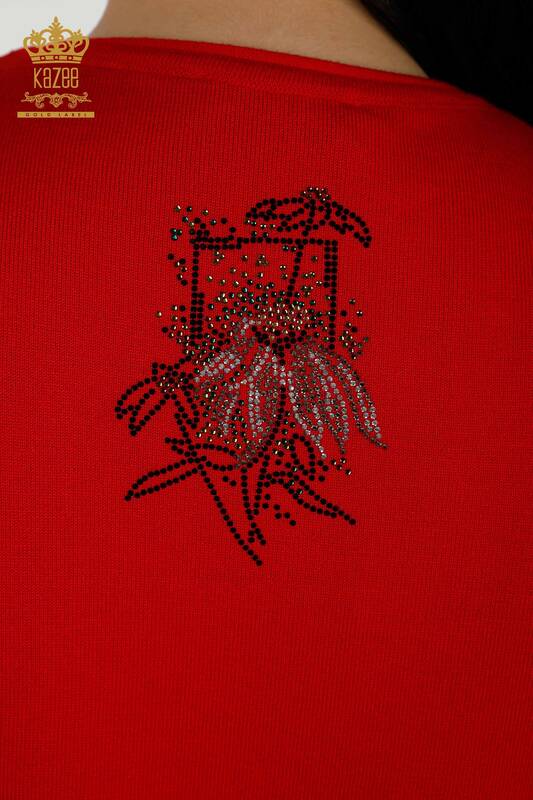 سترة نسائية تريكو نسائية بأكمام قصيرة مزخرفة بالزهور حمراء مطرزة بالأحمر - 16963 | كازي