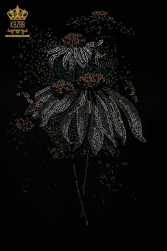 Vente en gros de pull en maille pour femmes à motifs floraux à manches courtes en pierre brodée noire - 16963 | KAZEE